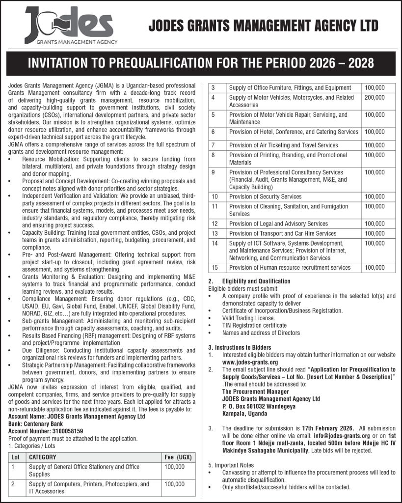 The deadline for submission is 17th February 2026. All submission will be done online on email: info@jodes-grants.org . Late bids will be rejected.